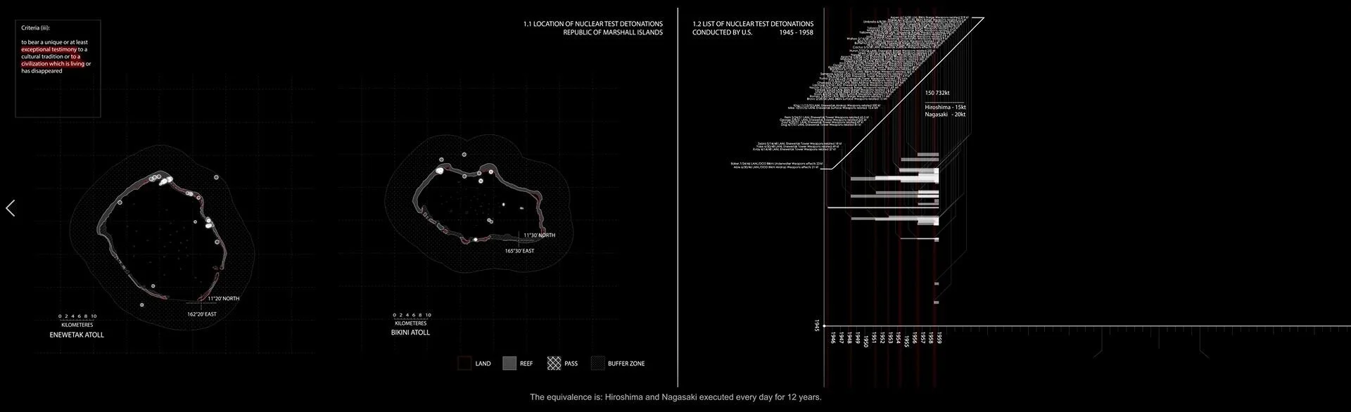 The project traces back the geopolitical influence of the U.S. administration on the republic during the Cold War subsequently leading to nuclear ecocide the effects of which have become even more emergent to manage today. The imminent risk of the submerging of the nation due to the rise of the world’s sea level, estimated to erase the Atolls between 2030 and 2060 poses a threat for further contamination of the Pacific Ocean and the extinction of the Marshallese culture. Centralizing the project around the radioactive waste site situated on the Enewetak Atoll referred to as the Runit Dome the work speculates on the possible consequences of the slow violence of nuclear colonialism and proposes a document nominating the atoll to become a UNESCO World Heritage Site.